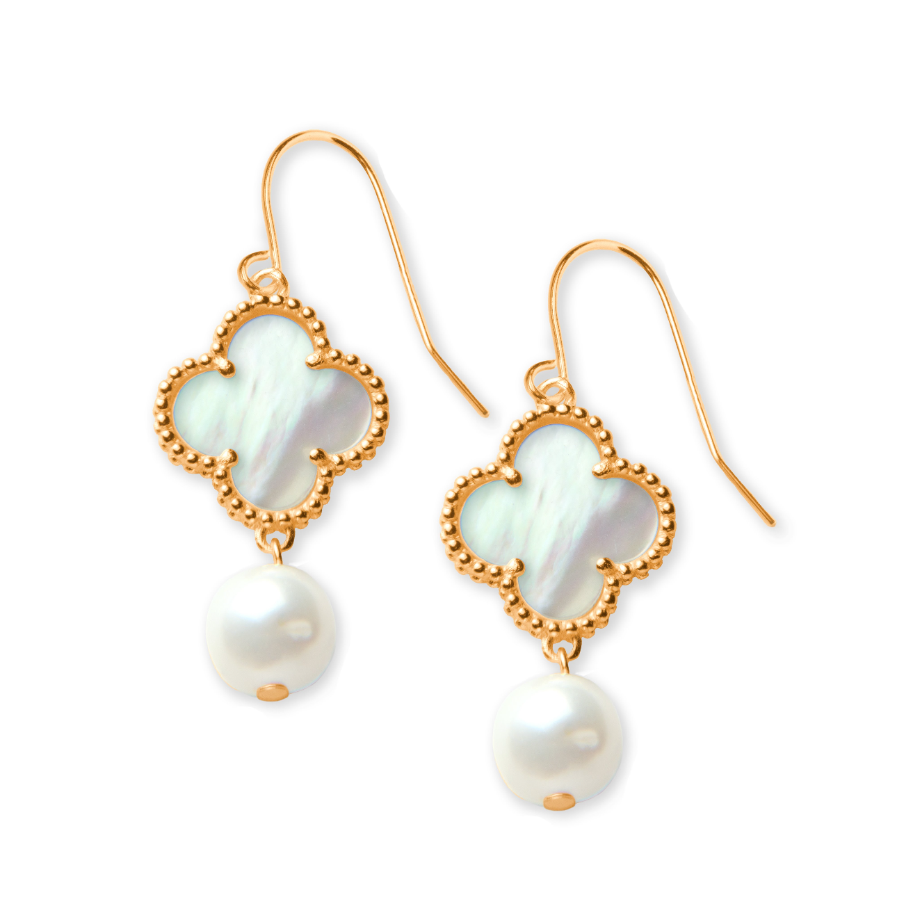 18K Gold Clover Drop Earrings with Freshwater Pearls